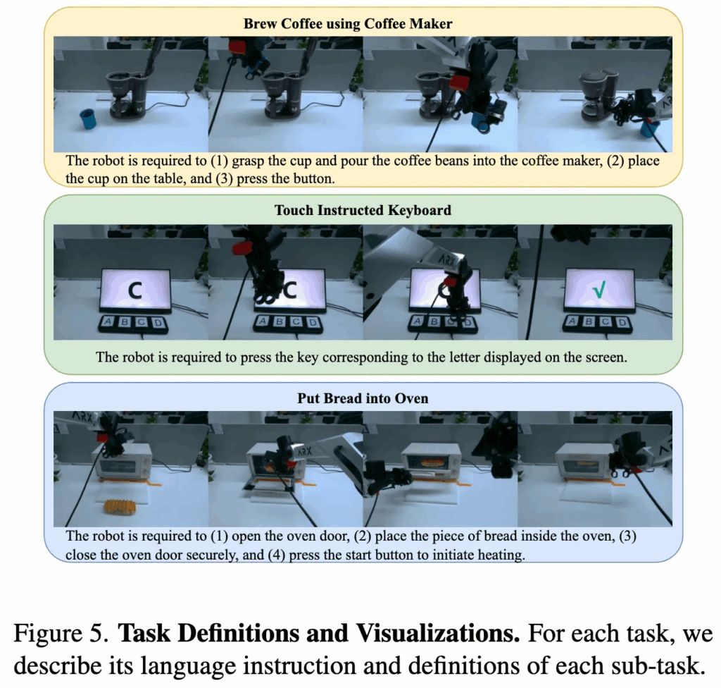 각 task마다 100개의 trajectory를 사용해 학습하며, simulation 환경과 마찬가지로 multi-task joint training 방식을 사용합니다. 즉, 각 로봇 플랫폼별로 모든 task를 하나의 모델로 함께 학습한 뒤, 개별 task에 대해 평가를 수행합니다. 이건 모델의 robustness와 generalization 능력을 보다 종합적으로 평가하기 위한 세팅이라고 하네요.