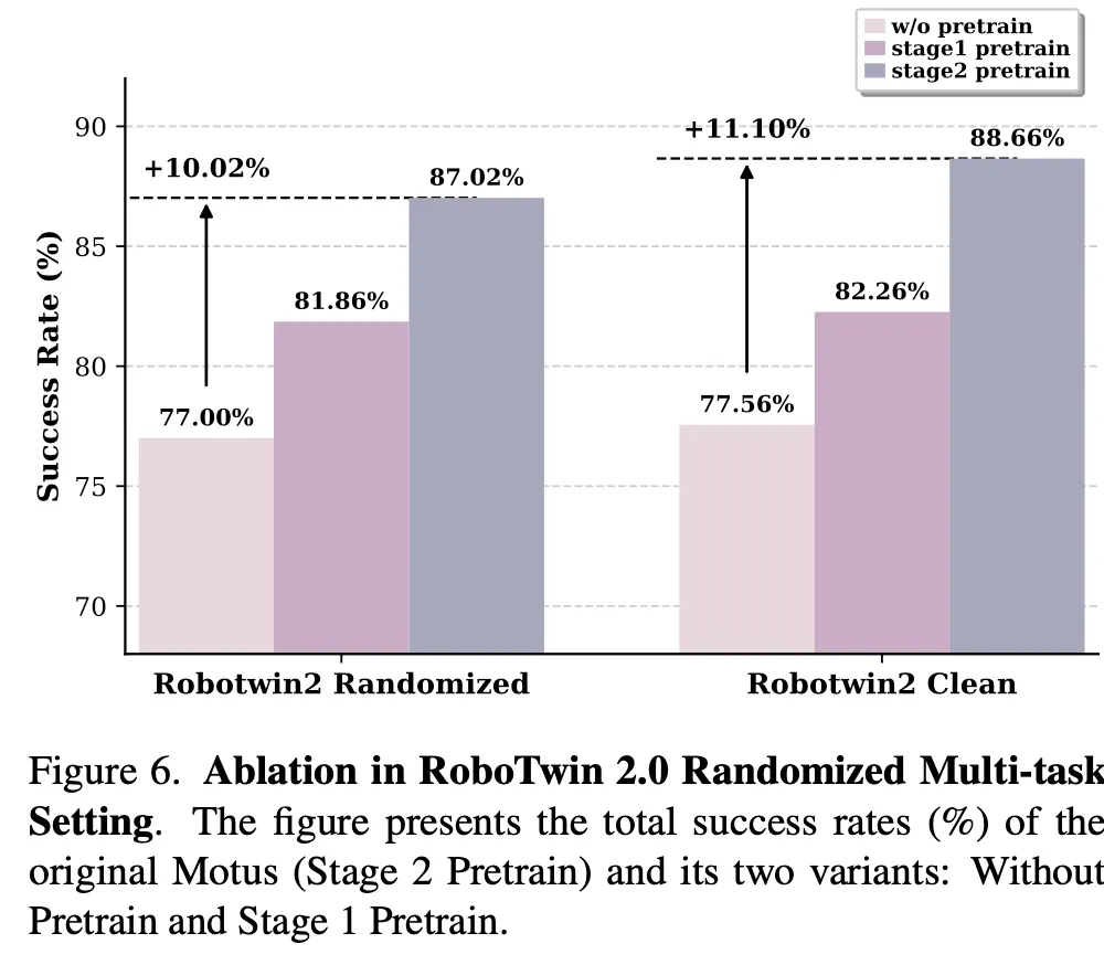 simulation 환경에서는 RoboTwin 2.0 simulator에서 accuracy를 측정했고, simulation 에 대한 실험 결과는 아래 Figure 6에서 보여줍니다. Stage1 pretrain은 VGM(비디오 생성 모델)만 사전학습(visual dynamics 적응)하는 단계이고, Stage2 pretrain 은 Motus의 핵심 단계로써 VGM + latent-action을 포함한 통합(pretraining with latent actions) 방식으로, VLM만 frozen하는 방식입니다.