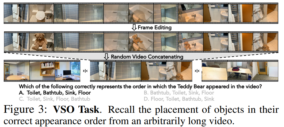 VSI-SUPER는 두 가지 파트로 분리되는 데, VSO(추후 VSR로 불림)와 VSC로 나뉩니다. VSO는 “Long horizion spatial observation and recall” task로 MLLM이 긴 영상을 관찰하고, 관심 물체가 나타난 순서에 맞춰 그 물체가 있었던 구체적 위치나 함께 있던 물건을 회상할 것을 요구합니다. 비디오 데이터는 이미지 편집 모델을 사용해서, 긴 비디오의 서로 다른 4개의 프레임에 테디베어 같이 “관심 객체”를 삽입하고, 이후 곰돌이가 나타난 프레임과 어느 공간에서 나타났는지도 기억해야 합니다. 아래 예시처럼, 객관식 Question과 등장 순서를 의미하는 보기들로 이루어져 있습니다.