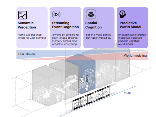 논문의 제목으로도 등장하고, 앞으로도 자주 등장할 단어인 spatial supersensing은 공간 인지 능력을 바탕으로 predictive world modeling까지 가겠다는 의미로 받아들이시면 되겠습니다. 각설하고, 논문에서는 크게 세 가지 주제를 잡았는데,