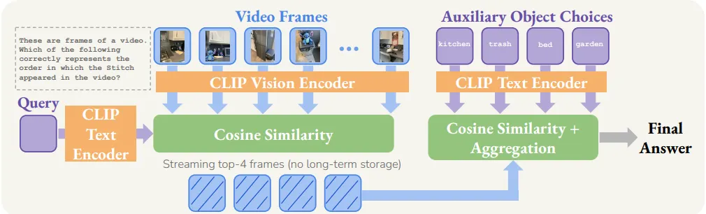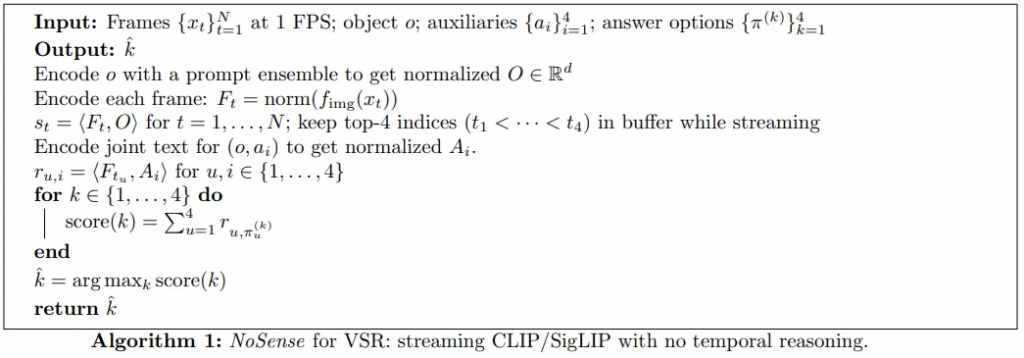 설계는 굉장히 간단한 편입니다. 먼저 비디오 입력의 경우, 비디오를 1초에 하나씩 뽑은 (1FPS로 샘플링) N개의 프레임들로 취급합니다. 각 프레임들을 vision encoder로 인코딩하고, 질문도 text encoder로 인코딩합니다. 이후 각 프레임 피처들과 텍스트 피처 간 코사인 유사도를 구해서 질문과 가장 관련 있는 프레임 4개를 선택합니다. (참고로 4개를 뽑는 이유는 VSR이 4가지 다른 환경에 관심 객체를 삽입하며 데이터셋을 구성했기 때문입니다. 서론의 VSO 예시 참조)그 다음 관심 객체와 각 auxiliary들을 함께 text encoding 해주고, 이전에 뽑앗던 4개의 프레임 피처와 유사도 행렬을 만들어줍니다. 마지막으로 객관식 문항은 auxiliary들의 permutation(1. kitchen→trash→bed→garden, 2. trash→garden→bed→kitchen, …)으로 4개의 보기가 있는데, 각 케이스에 따른 유사도 점수를 종합해서 가장 높은 점수가 나온 문항을 정답으로 선정합니다. 이 Nonsense의 특징은 프레임들을 독립적으로 다뤘기 때문에 비디오의 시간 정보를 무시했고, 네 개의 관련 높은 프레임만 추출하여 장기 기억 능력도 없으며, 코사인 유사도 기반 점수를 사용해서 LLM도 사용하지 않았다는 것입니다. 결국 Cambrian-S 논문에서 지향했던 spatial supersensing이나 공간 인지, world modeling 능력이 Nonsense는 전혀 없음에도 불구하고, 이 Nonsense가 VSR 벤치마크에서 gemini, Cambrian-S 같은 MLLM들을 압도하며 거의 완벽하게 문제를 해결했습니다.