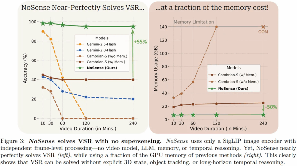 제목처럼 “과연 벤치마크(VSI-SUPER)가 실제로 모델의 spatial supersensing 능력을 요구하는 지” 확인하는 파트입니다. 이를 위해 저자들은 VSR 벤치마크 해결을 위해 Nosense라는 단순한 baseline을 설계했고, Gemini, Cambrian-S 등의 다른 MLLM 모델과 성능을 비교했습니다.