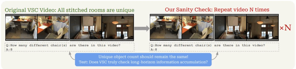 Cambrian-S는 token context의 개수를 조절해서 입력으로 넣는 brute-force 방식이 아니라, 진정한 spatial reasoning 평가를 위해 VSI-SUPER 벤치마크를 도입했습니다. 따라서 진정한 공간 인지 능력과 기억력을 가진 모델은 위 벤치마크에서 강력한 성능을 낼 것이라는 전망이 있지만, 여기서 반박 논문의 저자들은 두 가지 문제를 제기합니다.