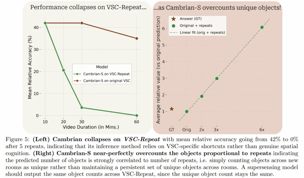 VSC에 맞춘 Cambrian-S의 추론 메커니즘은 위에서 설명했기에 생략하겠습니다. 이러한 추론 방법론 설계는 내재적으로 각 segment(event)가 단 한 번만 방문되는 서로 다른 환경이라고 가정하고 있습니다. 집을 돌아다니는 영상이 있다면, 갔던 방은 절대 되돌아가지 않는다는 암묵적인 규칙을 정했다는 것이죠 (하나의 event가 끝나면 buffer를 아예 초기화시키며 이전 프레임 피처 정보를 없애기 때문). 저자들은 이 점을 매커니즘의 허점으로 생각하고 분석 실험을 진행했습니다. Sanity check는 이번에 처음 본 단어인데, “논리적으로 타당한지 확인하는” 일종의 검증 과정으로 보시면 되겠습니다. 위에서 “재방문은 배제한다”라는 식의 가정이 있었기 때문에, sanity check를 위해 저자들은 VSC 내 같은 비디오를 1~5번 이어붙여서 VSC-Repeat이라는 데이터셋으로 검증을 실시합니다. 만약 모델이 spatial supersensing 능력을 가지고 있다면, 반복되는 장면을 인지하고 자신이 셌던 물체의 개수에 변화를 주지 않아야 합니다.