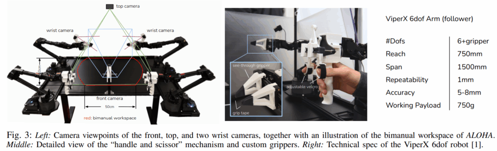 ALOHA의 leader 부분은 조작 용이성을 위해 ViperX 6-DoF보다 사이즈가 더 작은 3300달러 비용의 WidowX를 써서 joint space mapping을 사용한다고 합니다(작은 로봇을 사용해도 joint 기반이기 때문에 사용자가 조작 중에 크게 어려움을 겪을 것이라고는 보이지 않습니다). VR과 같은 컨트롤러를 사용하지 않는 이유는 singularity 문제를 잘 해결하지 못하고, 계산량이 추가로 들어간다는 것의 한계가 있습니다. 또한 로봇의 속도에 맞추지 못하고 사람이 빨리 움직이는 현상도 방지하고, 장치를 기반으로 하기에 작은 진동을 VR보다 상쇄할 수 있다는 이점이 존재합니다.