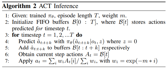 이러한 chunking 방식을 무작정 연결하는 것은 부드러운 움직임을 주지 못하기 때문에 각 타임스텝마다 정책을 Query한 후 예측을 결합하기 위해서 temporal ensemble, 지수 가중치 방식을 사용합니다. w_{i}= \exp(-m*i)(m은 가중치가 얼마나 빨리 줄어들게 할지 하는 하이퍼 파라미터, i는 예측이 생성된 시점으로부터의 거리 또는 순서) 식을 활용해서 현재 타임에 맞는 aciton을 지수 가중치 방식을 통해 결합합니다.