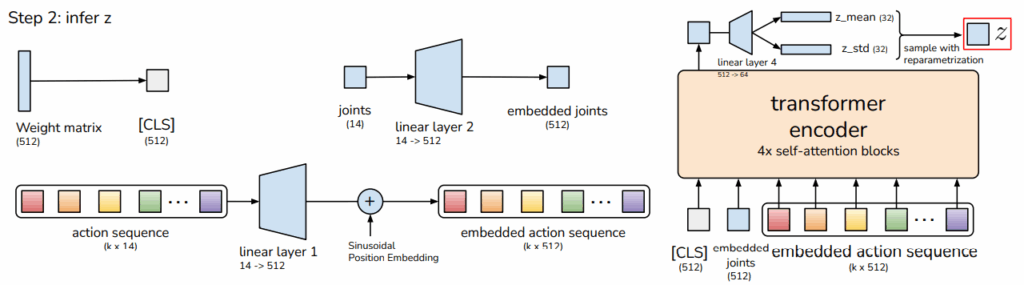 구체적인 이해를 위해 부록에 있는 사진을 보면 가중치들의 전체적인 흐름(?)을 담고 있는 CLS와 linear layer를 통과한 embedded joint, action sequence를 transformer encoder에 넣어줍니다. 여기서 action sequence는 시간에 대한 순서를 위해 position embedding을 해줍니다. transformer encoder에서 나온 값을 linear layer에 통과시켜서 latent space인 z를 만들어줍니다. CLS의 개념은 BERT에서 나온 개념으로 action sequence에 대한 정보를 함축하면서 학습한 값(?)이라 이해하시면 쉬울 것 같습니다.