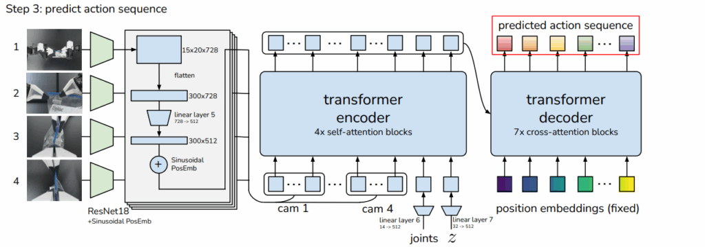 이렇게 만들어진 Z는 CVAE의 Decoder 구조에 들어갑니다. 이때는 resnet을 통과한 feature(15 x 20 x 728)를 flatten 시킨 값을 300 x 512로 맞춘 후 공간 정보를 유지하기 위해 transformer의 positional embedding과 위치에 대한 값을 추가해줍니다. 이를 z, joint 함께 인코더에 넣고 나온 값을 transformer decoder에 K, V로, k step의 시간 정렬을 위한 position embedding은 Q로 들어가서 예측 action sequence를 뽑아내게 됩니다. 여기서 나온 값의 차원은 k x 512 차원이기 때문에 MLP를 통해 k x 14(7 DoF 로봇 2개의 joint)로 down-projection되어 k스텝동안 예측된 target joint positions에 대응하게 됩니다.