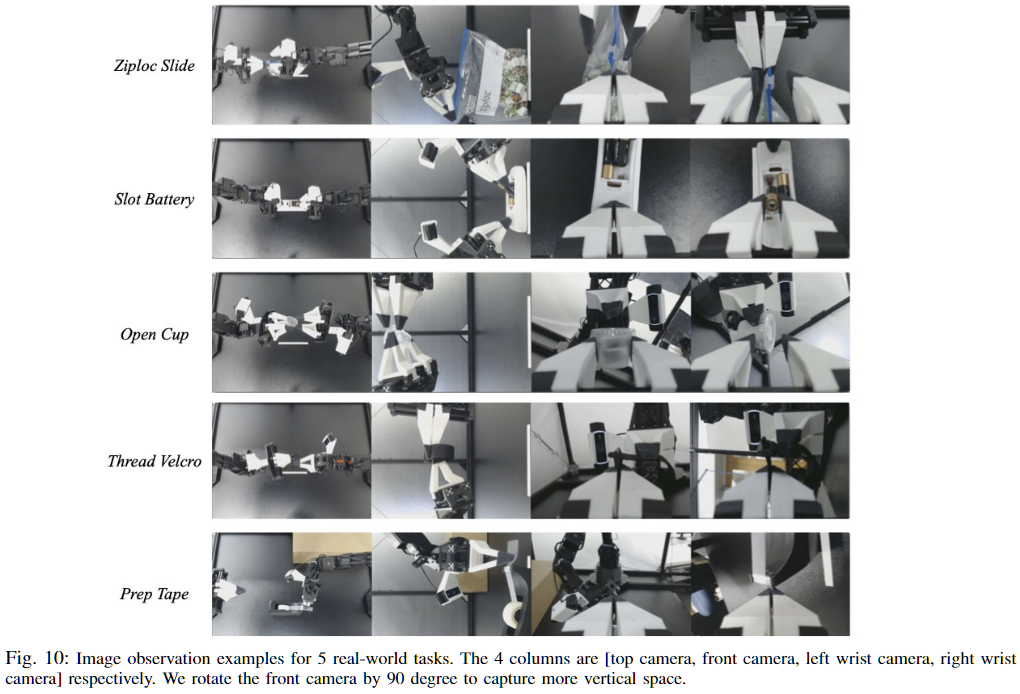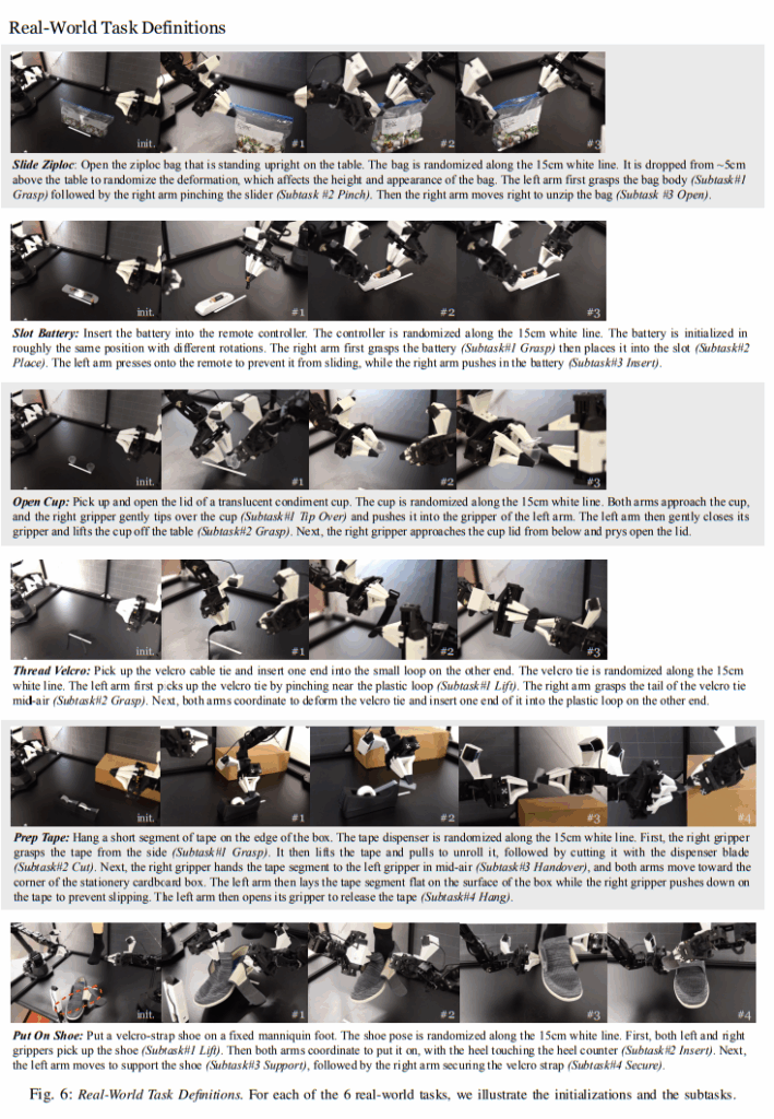6개의 실제 작업에 대해서는 ALOHA 텔레오퍼레이션 시스템을 활용하여 시연 데이터를 수집합니다. 각 시연은 작업에 따라 약 8–14초가 소요되며, 이는 50Hz 제어 주기를 기준으로 약 400–700 타임스텝에 해당합니다. Thread Velcro 작업을 제외한 모든 작업에 대해 50개의 시연을 수집하고, Thread Velcro 작업에 대해서는 난이도를 고려하여 100개의 시연을 기록합니다. 이에 따라 각 작업당 시연 데이터의 총량은 약 10–20분 분량이며, 물체 재배치 및 텔레오퍼레이터의 실수로 인한 재시도를 포함하면 실제 데이터 수집에는 약 30–60분이 소요됩니다.