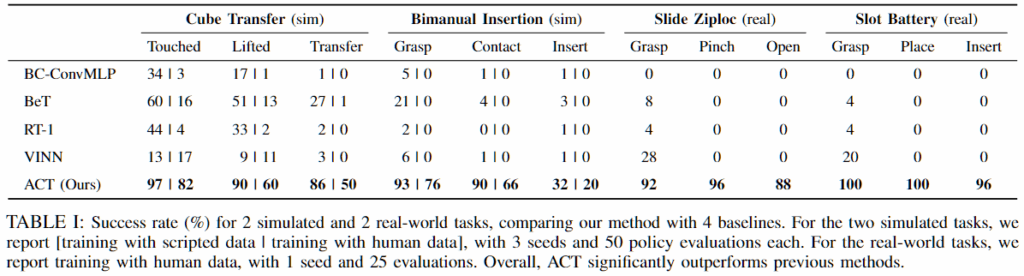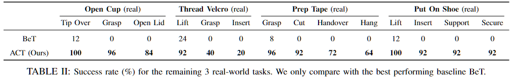 실험 결과 ACT는 기존 방법들보다 전반적으로 더 높은 성능을 보입니다. 이는 비마르코프적 행동을 효과적으로 학습하고, 기존 imitation learning에서 자주 발생하던 로봇 정지 문제를 완화했다고 논문에서는 분석했습니다. 인간 시연 데이터를 사용한 경우 시뮬레이션 데이터보다 성능이 낮게 나타났으며, 이는 인간 데이터의 확률성과 다중 모달성이 imitation learning 문제를 더욱 어렵게 만들기 때문입니다. (아래 표에서는 비교 대상 중 가장 높은 성능을 보인 BeT와의 결과를 비교합니다.) Thread Velcro 작업에서는 단계가 진행될수록 성능이 저하됩니다. 2단계에서는 오른쪽 팔이 그리퍼를 너무 일찍 닫아 공중에서 케이블 타이의 꼬리를 잡지 못하는 문제가 발생합니다. 3단계에서는 삽입 정밀도가 부족하여 케이블 타이의 루프를 놓치는 경우가 많습니다. 이러한 실패는 케이블 타이가 배경 대비가 낮고 이미지에서 차지하는 비중이 작아, 시각 관찰만으로 정확한 위치를 추정하기 어렵기 때문이라고 결론지었고, 실제로도 그리퍼를 보면 크게 눈에 케이블 타이가 잘 안보인다는 것을 확인할 수 있었습니다.