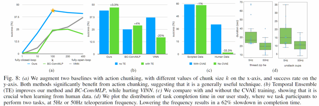 Fig. 8에서 (a)를 보면 k=1에서는 성능이 매우 낮게 나타나며, k가 증가함에 따라 성능이 크게 향상됩니다. 그러나 k가 지나치게 커질 경우 반응형 행동이 감소하고 긴 행동 시퀀스 모델링이 어려워져 성능이 다시 하락합니다. BC-ConvMLP에서는 출력 차원을 확장하여 action chunking을 적용하고, VINN에서는 다음 k개의 행동을 검색하는 방식으로 이를 구현하였습니다. 이 결과는 ACT 모델만을 개선한 것만이 아니라, action chunking 자체가 성능 향상을 가져온다는 점을 보여줍니다. Temporal Ensembling은 전반적으로 소폭의 성능 향상을 제공하였으나, VINN과 같이 유사 행동을 검색하는 방법에서는 가중 평균이 오히려 성능 저하로 이어지는 것을 볼 수 있었습니다.