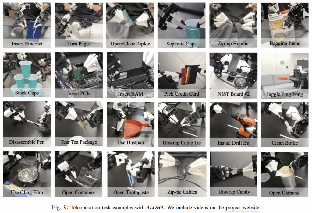 ALOHA 플랫폼에서 Shadow Teleoperation System에서 할 수 있는 15가지 작업 중 Baoding ball in-hand rotation task 빼고(손가락이 없어서) 14개까지 커버가 가능하다고 합니다.