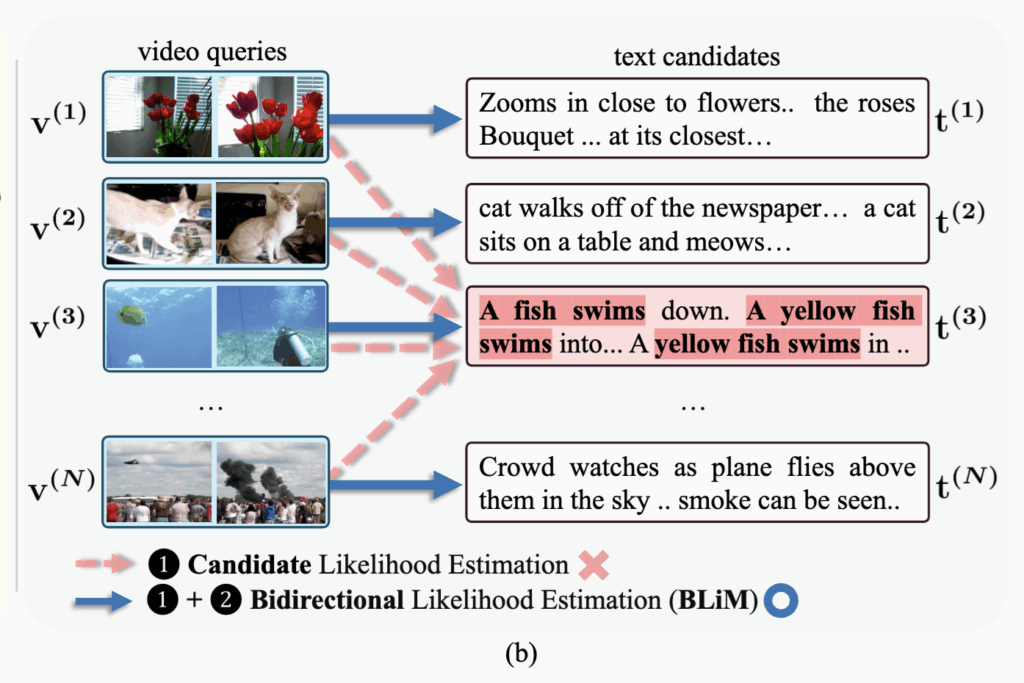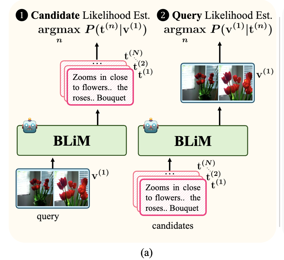 이를 해결하기 위해 본 논문에서는 Bidirectional Likelihood Estimation with MLLM(BLiM)을 제안했습니다. 상단 Figure 1(a)와 같이, BLiM은 비디오로부터 텍스트를 생성하는 likelihood와 텍스트로부터 비디오를 생성하는 likelihood를 함께 고려하여, 쿼리–후보 간의 의미적 정합성에 더 집중하도록 설계하였다고 합니다. 또한 저자들은 candidate likelihood에 포함된 prior 효과를 완화하기 위해, 학습 없이 적용 가능한 Candidate Prior Normalization(CPN) 기법을 함께 제안하였는데, 자세한 내용은 리뷰를 통해 알아보겠습니다.