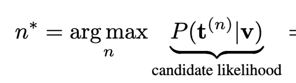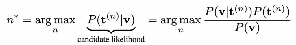 Video-to-text retrieval에서 일반적으로 사용되는 추론 방식은 다음과 같습니다. 주어진 비디오 v에 대해, 텍스트 후보 t^{(n)} 중 가장 높은 candidate likelihood P(t^{(n)} \mid v)를 가지는 후보를 선택.