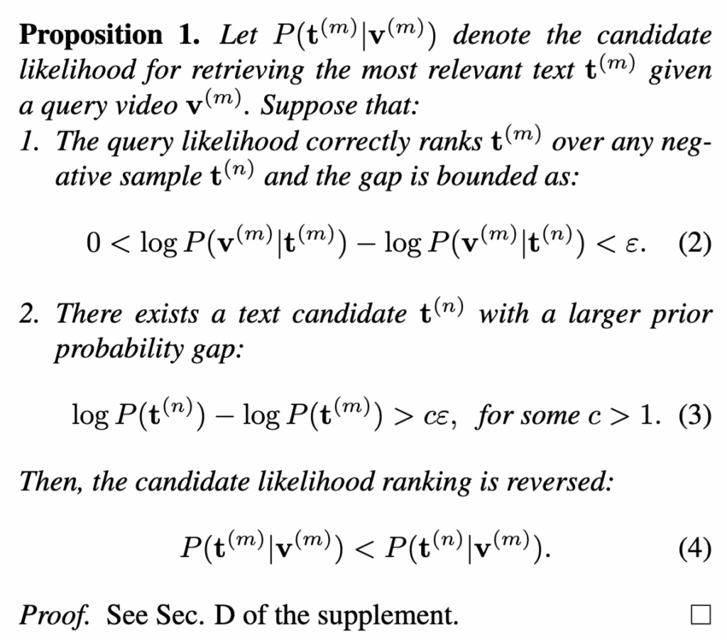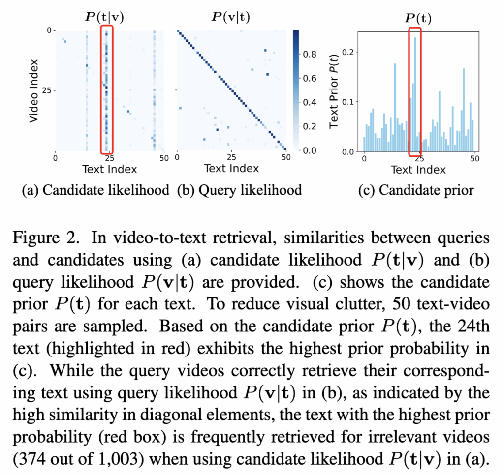Figure 2에서 이러한 현상을 직관적으로 확인할 수 있는데요. Query likelihood 기준(Fig. 2b)에서는 비디오와 텍스트가 올바르게 대응되지만, candidate likelihood 기준(Fig. 2a)에서는 특정 텍스트 하나가 여러 비디오에 반복적으로 선택됩니다. 이는 Fig. 2c에서 보이듯 해당 텍스트가 가장 높은 candidate prior를 가지기 때문이라고 합니다.