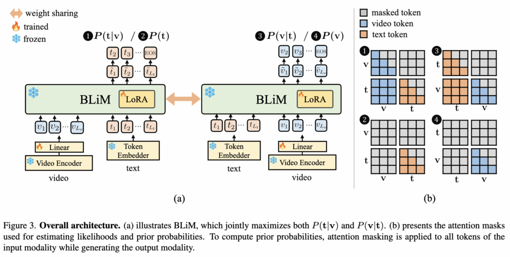학습 과정에서 BLiM은 두 가지 likelihood를 동시에 최대화하도록 설계되었습니다. 첫 번째는 기존 MLLM과 동일한 video-grounded text generation, 즉 비디오가 주어졌을 때 텍스트를 생성하는 likelihood P(t|v)입니다. 이는 텍스트를 autoregressive하게 생성하면서, 각 토큰의 확률을 최대화하는 일반적인 언어 모델 학습 방식과 동일합니다.