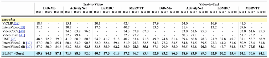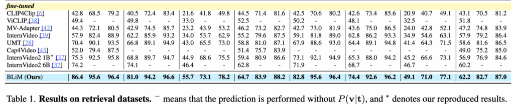 Table 1에서는 BLiM을 기존 모델들과 비교한 결과를 보여줍니다. 먼저 zero-shot 설정에서는, 사전 학습된 MLLM이 P(t \mid v)만 사용할 수 있다는 한계로 인해 query likelihood 없이 CPN만 적용한 BLiM⁻을 사용합니다. 그럼에도 불구하고 BLiM⁻은 기존 SOTA인 InternVideo2 6B 대비 평균 R@1 기준 4.9 향상을 보이며, 단순한 prior 정규화만으로도 의미 있는 성능 개선이 가능함을 보여줍니다.