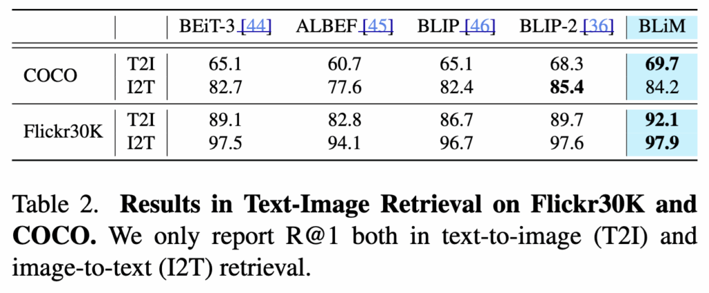 Table 2의 결과에 따르면, BLiM은 Flickr30k와 COCO 데이터셋에서 BLIP-2를 포함한 기존 Text-Image Retrieval 모델들을 전반적으로 뛰어넘는 성능을 보였습니다. 특히 Flickr30k의 text-to-image retrieval에서는 R@1 기준으로 BLIP-2 대비 2.4 향상을 기록하며, 양방향 likelihood 추정이 이미지 기반 retrieval에서도 효과적으로 작동함을 보여줍니다.