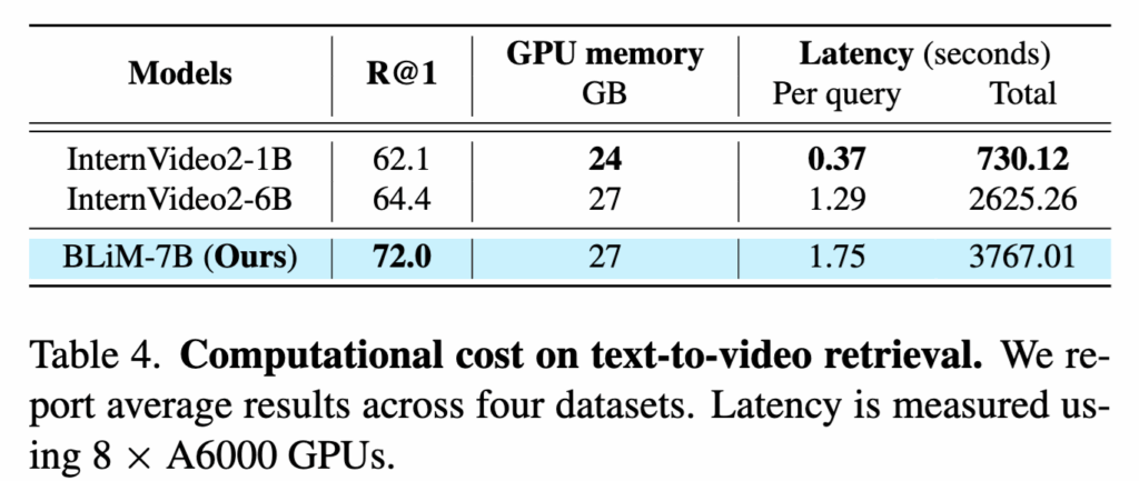 BLiM의 계산 비용 결과도 InternVideo2와 비교하였습니다. BLiM은 1차로 경량 모델을 사용해 후보를 추린 뒤, 양방향 likelihood 기반으로 재랭킹하는 two-stage 구조를 사용하기 때문에 전체 추론 시간에는 1차 retrieval 비용이 포함됩니다. 그럼에도 불구하고, BLiM은 InternVideo2 6B 대비 R@1 성능을 크게 향상시키면서도, 쿼리당 약 0.46초의 latency만 발생시키고 GPU 메모리 사용량도 유사한 수준. 이는 BLiM이 높은 성능 향상을 비교적 작은 계산 비용 증가로 달성했음을 보여주는 결과라고 하네요.