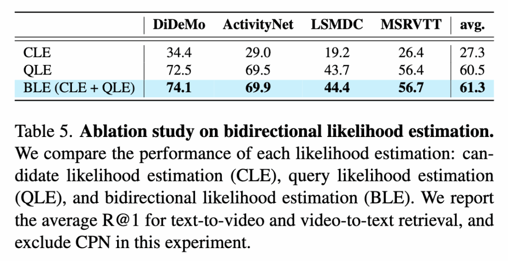이렇게 학습된 BLiM은 추론 단계에서 두 likelihood를 함께 사용해 최종 retrieval 결과를 결정합니다. Video-to-text retrieval의 경우, 주어진 비디오 쿼리에 대해 텍스트 후보가 비디오로부터 얼마나 잘 생성될 수 있는지에 해당하는 candidate likelihood P(t|v)와, 해당 텍스트가 다시 비디오를 얼마나 잘 설명할 수 있는지를 나타내는 query likelihood P(v|t)를 합산하여 점수를 계산합니다. 즉, “비디오가 이 텍스트를 만들 가능성”과 “이 텍스트가 비디오를 만들 가능성”을 동시에 고려하는 방식이죠