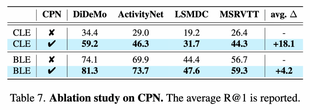 마지막으로 CPN ablation 실험 결과입니다. candidate likelihood에 CPN을 적용했을 때 모든 데이터셋에서 R@1 성능이 크게 향상되는 것을 확인했습니다. 또한 bidirectional likelihood 설정에서도 CPN을 추가하면 평균적으로 추가적인 성능 개선이 나타났습니다.
