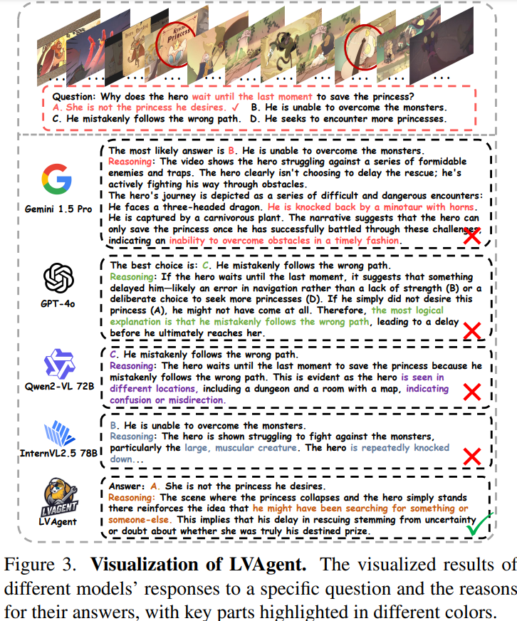 실제로 Figure 3의 예시처럼, 전체 비디오를 Gemini 1.5Pro, GPT-4o, Qwen2-VL, InternVL-2.5에 입력했을때 이 모델들은 공통적으로 정답을 못 맞추는 모습을 보입니다. 저자 설명에 따르면 원인은 비디오 안에 쌓여 있는 redundant하고 헷갈리는 정보 때문이고, 그게 색깔 텍스트로 표시되어 있습니다. 즉, 모델이 중요 단서만 선택해야 하는 상황에서 오히려 정보 과잉으로 올바른 답변을 제공하지 못하고 있습니다.