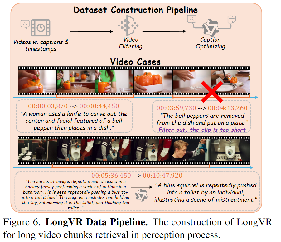 추가적으로 저자들은 CLIP의 domain gap을 해결하기 위해 ASP-CLIP을 LongVR 데이터셋으로 파인튜닝합니다. LongVR은 5개 데이터셋(ActivityNet, OpenVid-1M, ViTT, MovieChat-Caption, Youcook2)에서 크롭한 82K clips로 구성하고, 5초 미만이거나 12분 초과되는 비디오 클립은 제거합니다. 캡션이 너무 길면 CLIP 컨텍스트 한계가 있어 Qwen2-VL로 캡션을 최적화 합니다. 또한 캡션 토큰 20 미만은 너무 짧아서 제거하여 최종 평균 길이 145.6초, 캡션 평균 71 tokens를 가지는 데이터셋을 만듭니다.