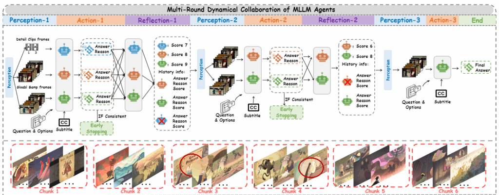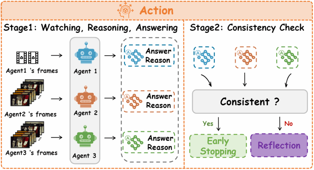 Action 단계는 단순한데 Perception으로 뽑은 프레임 Vsamp기반으로 각 에이전트가 답 ansi와 이유 Ri를 생성하고 에이전트 답변이 과반수를 넘으면 그 답으로 early stop을 하고 합의를 실패하면 Reflection을 하게 됩니다.