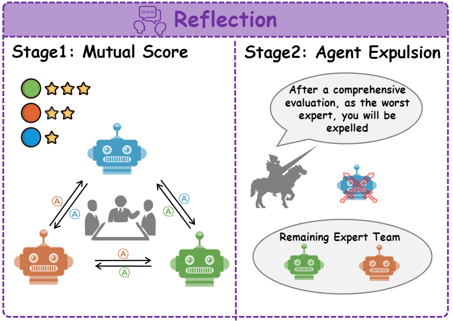 (4) Reflection: 다음으로 매 라운드 토론에서 각 에이전트의 성능을 평가해 점수를 매기고, 잘못된 추론을 하는 에이전트는 걸러내며, 질의마다 동적으로 협업 구성을 바꿉니다.