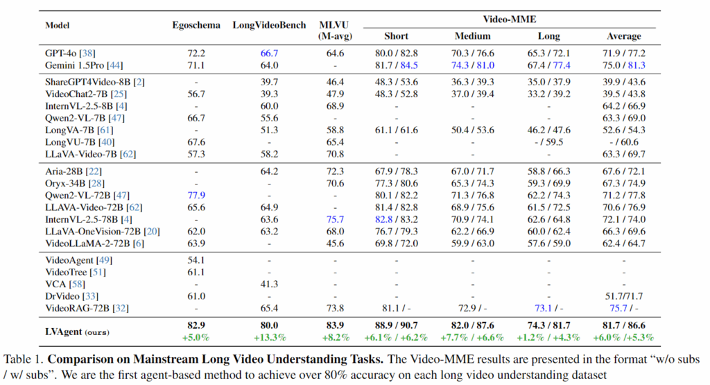 이 네 과정 전체를 통해 에이전트들은 토론하면서 필요한 영상 구간을 다시 찾고 서로 정보를 통합하면서 답을 점진적으로 다듬습니다. 저자들은 이를 4개 롱 비디오 벤치마크(EgoSchema, VideoMME, MLVU, LongVideoBench)에서 검증했고,주류 롱 비디오 태스크에서 80%가 넘는 정확도를 달성했다고 리포팅합니다. contribution는 크게 세 가지로 정리됩니다.