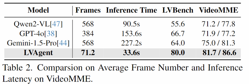 Table 2에서 VideoMME 벤치마크에서 기존의 최신 모델들과 비교하여 효율성과 성능을 어떻게 개선했는지 보여줍니다. LVAgent는 다른 모델들에 비해 훨씬 적은 수의 프레임(71.2)을 사용하고,추론 속도도 또한 33.6s로, 다른 모델들보다 빠른 추론 속도를 보입니다.