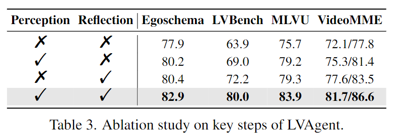 Table 3에서 Perception과 Reflection에 대한 Ablation stydy 결과를 리포팅합니다. Perception만 쓰거나 Reflection만 써도 성능이 오르지만, 둘을 결합했을 때 가장 성능이 많이 올라 EgoSchema 82.9%, LongVideoBench 80.0%를 달성합니다.