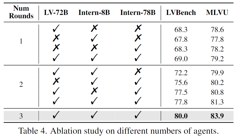 Table 4에서 LLaVA-Video-72B, InternVL-2.5-8B, InternVL-2.5-78B 에이전트 조합과 협업 라운드 수를 분석한 결과를 나타냅니다. 단독 성능은 LVBench에서 각각 68.3%, 67.8%, 69.0%이고 협업 라운드가 늘어날 수록 성능이 증가하여 최종적으로 세 에이전트를 모두 결합하면 LVBench 80.0%, MLVU 83.9%로 최고 성능을 달성합니다.