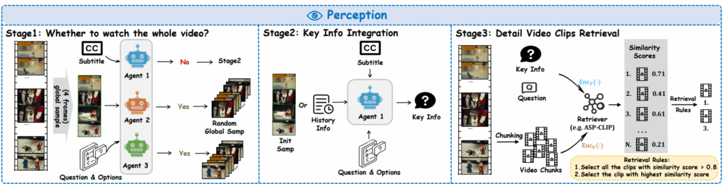 Perception은 중복 정보의 간섭을 줄이고, 비디오의 핵심 영역을 검색하며, 질문에 더 효과적으로 답하기 위해 3단계 인식 파이프라인을 제안합니다.