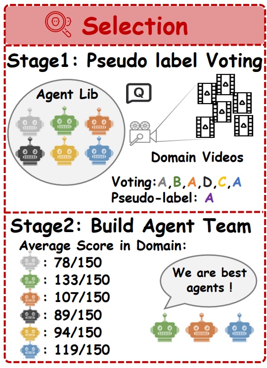 멀티 에이전트 시스템을 구축할때 생기는 하나의 문제는 에이전트마다 도메인/태스크에 따라 성능 편차가 크고, 성능이 낮은 에이전트가 협업을 방해하고 계산도 낭비된다는 점이 있습니다. 그래서 저자들은 Agent Library(Qwen2-VL, InternVL-2.5, LongVU, LLaVA-Video)를 만들어두고, 여기서 사전 선발(pre-selection)을 합니다. 사전 선발을 하기 위해 라벨이 없는 데이터에서 pseudo label을 만듭니다.