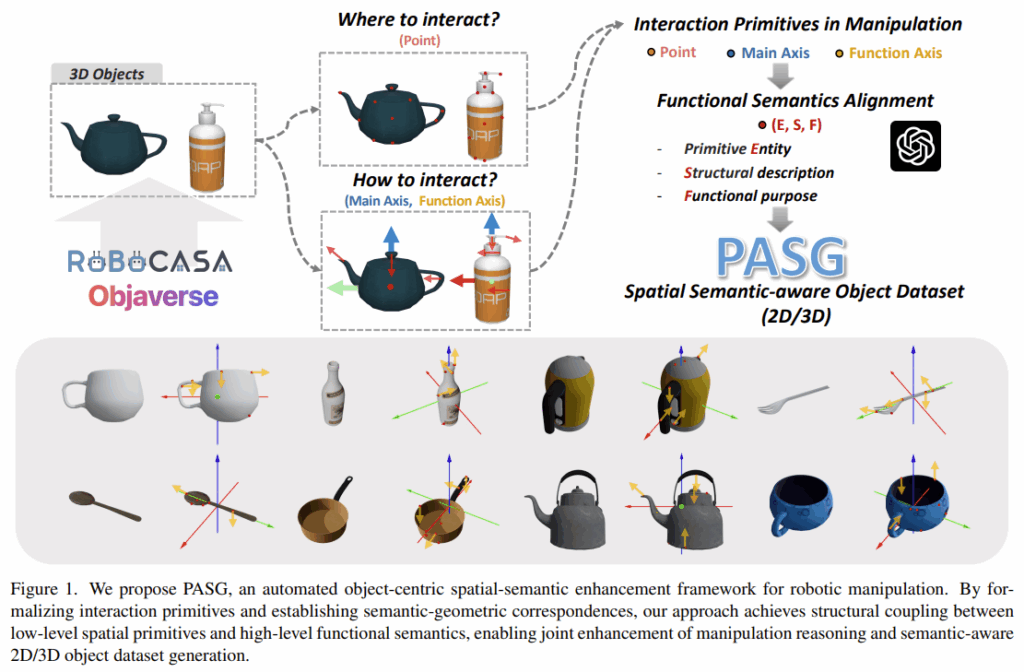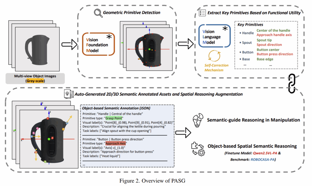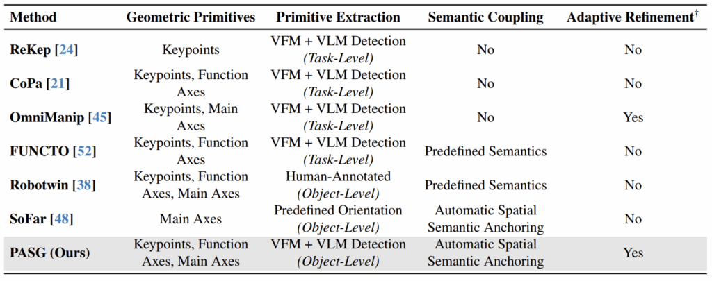 해당 논문은 로봇 조작에서 작업 의미론과 기하학적 primitives를 연결하는 closed-loop 프레임워크인 PASG를 제안하며, 자동화된 기하학적 primitives 추출과 VLM 기반 의미론적 앵커링을 결합함으로써, PASG는 동적 공간-의미론적 추론을 가능하게 합니다. 또한, 다양한 조작 작업에 걸친 RoboTwin 플랫폼에서의 평가는 PASG가 인간 주석과 경쟁력 있는 성능을 보이며, 특정 작업에서는 더 좋은 성능을 보임을 입증합니다. PASG의 다양한 interaction primitives 생성 능력은 작업 유연성과 강건성을 향상시켜 실제 응용에 적합하게 만듭니다. 추가로, Robocasa-PA 벤치마크와 파인튜닝된 Qwen2.5VL-PA 모델을 통해 프레임워크의 효과를 입증하였으며, 로봇 조작에서 일반화 및 cross-domain adaptability를 향상시키는 고품질 annotation 데이터를 생성하기 위한 자동화된 파이프라인을 제공합니다.