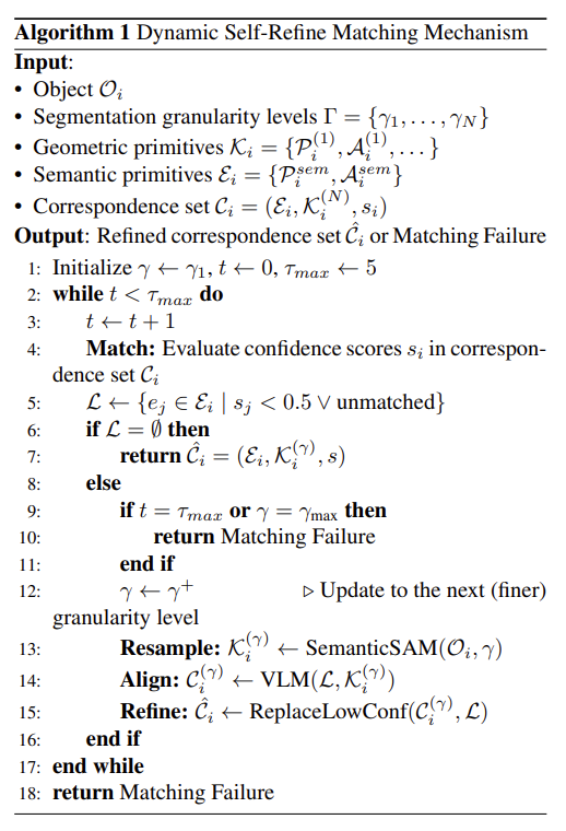 primitives의 부정확성과 특징 추출기로 인한 정보 손실을 해결하기 위해, 아래의 알고리즘 1과 같은 동적 self-refine 매칭 방식을 이용합니다. 먼저, 0.5 미만의 낮은 신뢰도를 갖거나 None이 포함된 primitives는 계층적 분할을 통한 annotation을 하도록 하며, Semantic SAM의 다중 세분화를 활용하여 재샘플링을 통해 기하학적 primitives를 정제하고 segment-align-detect-resample이라는 closed loop 플로우를 형성합니다. 실험결과 이러한 방식이 저자들의 데이터셋에서 98%의 매칭 성공률을 보였으며, 열악한 분할로부터 오류를 효과적으로 완화하였다고합니다.