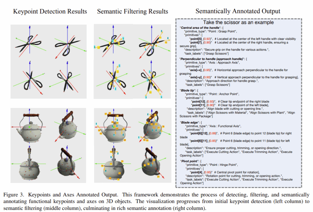 객체 o에서 여러 기하학적 keypoint p_i \in \mathcal{K}^o_{filter}가 \mathcal{E}^o의 의미론적 설명과 일치할 때 신뢰도 점수 s \in [0,1] 와 모든 후보를 기록하고, 일치하지 않을 경우 None을 반환합니다. 의미론적 방향의 경우, principal axis와 기능적 용도에 따른 방향을 함께 활용하는 것 같습니다.