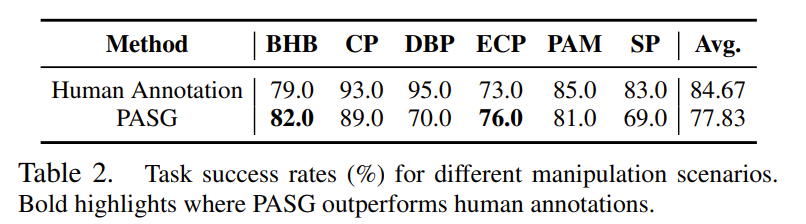 - 실제 조작 시나리오에서 PASG 효과를 임증하였으며, 사람이 라벨링한 방식과 비교했을 때 경쟁력 있거나 개선된 성능을 달성