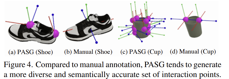 기하학적 annotaion이 달린 object 데이터셋을 생성하는 것을 넘어, 해당 프레임워크는 공간적-의미론적 정보를 조작 작업에 통합하는 것을 목표로 합니다. 주석이 달린 객체와 멀티모달 입력을 활용하여 PASG 파이프라인이 다양한 객체 범주에 걸쳐 interaction primitives를 안정적으로 식별할 수 있음을 실험적으로 보였습니다. 수동 라벨링 된 데이터와 비교하였을 때 PASG로 생성된 주석이 더 다양한 의미론적 정보를 포함하는 것을 확인하였으며, 이러한 다양성을 기반으로 후속 작업과 다양한 조작 작업에 효과를 보였다고합니다.