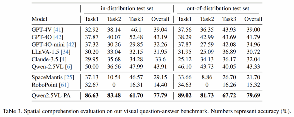 모델 일반화를 평가하기 위해 Robocasa-PA는 다음 세 가지로 나뉩니다. 먼저 기본 객체로 지정된 풀에서 6,979개의 질문을 생성하고, primitive 구조에 대한 기초적인 이해를 확립하기 위해 80%(5,583개 질문)를 fine-tuning용 학습 데이터로 할당합니다. 동일한 객체 풀의 나머지 20%(1,396개 질문)로 in-distribution test 셋을 구성합니다. cross-domain adaptability를 엄격하게 평가하기 위해, 객체 및 primitive 모두에서 학습 인스턴스와 격리된, unseen 객체에서 파생된 1,364개의 질문으로 구성된 out-of-distribution test 셋을 구성합니다.