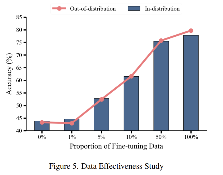 마지막으로, 데이터 효율을 확인하기 위해, 원본 학습 데이터에서 무작위로 1%, 5%, 10%, 50%의 데이터를 샘플링하여 실험을 수행하였습니다. 아래의 figure 5가 이에 대한 실험 결과로, 5%부터 베이스라인(Qwen-2.5VL)대비 10%정도의 성능 개선 뿐만 아니라 기존의 다른 방법론들보다 더 개선된 성능을 보여주는 것을 확인할 수 있습니다. 뿐만 아니라, out-of-distribution 결과에 대해서도 성능 격차가 ±2% 이내로 안정적이었다고 합니다.(아래 그래프의 분홍 선)