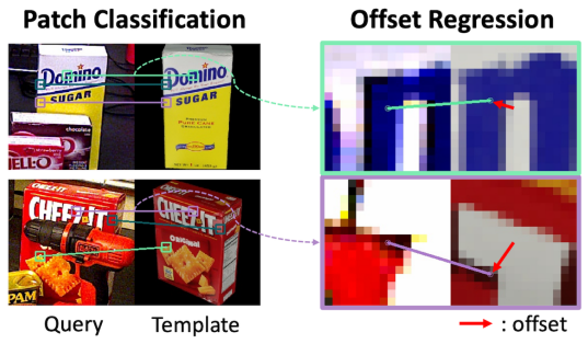 먼저, 기존 방식들이 템플릿 간의 불연속적인 차이 때문에 대응점을 찾지 못했던 문제를 해결하기 위해 패치 단위의 Classification와 오프셋 Regression를 결합한 하이브리드 표현 방식을 도입했습니다. 단순히 템플릿을 선택하는 것이 아니라, 패치 내에서 픽셀 수준의 위치 편차를 직접 계산함으로써 적은 수의 템플릿만으로도 매우 정교한 초기 포즈를 도출해냅니다.