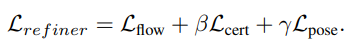 이어서 초기 포즈를 정밀하게 보정하는 Pose Refinement 단계에서는 flow의 오차와 기하학적인 포즈 오차를 통합적으로 고려하여 학습이 진행됩니다. 이 단계의 손실 함수는 흐름의 정확도, 대응점의 유효성, 그리고 최종적인 포즈의 정밀도를 모두 반영하도록 설계되었습니다.