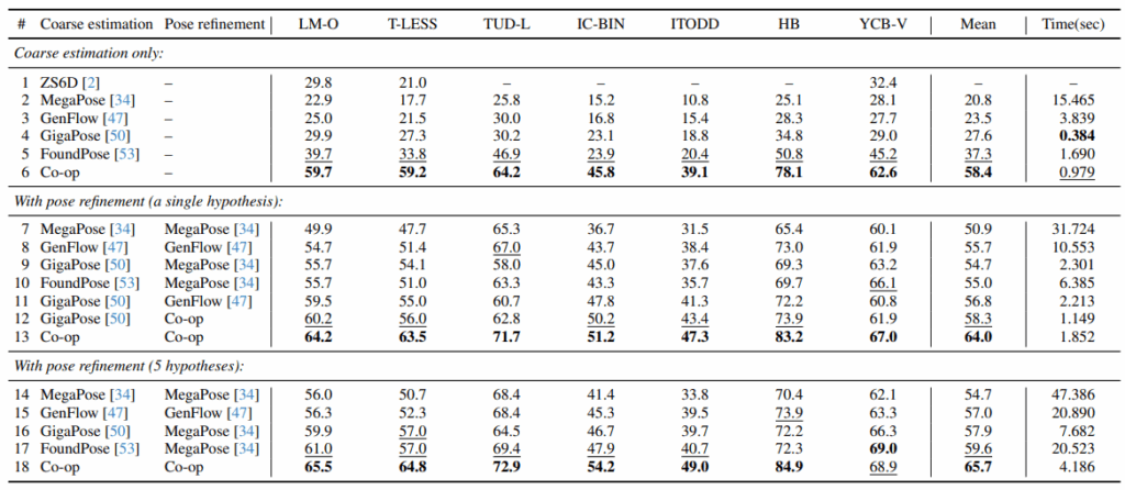 Co-op 모델의 성능은 BOP Challenge의 7개 핵심 데이터셋인 LM-O, T-LESS, TUD-L, IC-BIN, ITODD, HB, YCB-V로 teest 하였으며, 모든 실험은 학습 시 보지 못한 물체에 대해 제로샷 환경에서 진행되었습니다. 실험 결과에 따르면 Coarse 단계만으로도 평균 AR(Average Recall) 58.4를 기록하며 기존 FoundPose의 37.3점 대비 약 56.6%의 압도적인 성능 향상을 보였습니다. 또한 리파인먼트 단계를 포함한 최종 포즈 추정 성능은 단일 가설 기준 64.0점, 5개 가설 기준 65.7점을 달성하여 MegaPose나 FoundPose 같은 기존 SOTA 모델들과의 격차를 크게 벌리며 우수성을 입증했습니다. 또한 효율성 측면에서도 이미지 내 모든 객체의 포즈를 추정하는 데 가설 수에 따라 1.85초에서 4.18초가 소요되어, 유사한 정확도를 보이는 기존 방식인 MegaPose가 약 31.7초 소요되던 것과 비교해 속도 개선을 이루어내고 정확도를 향상시켰습니다.