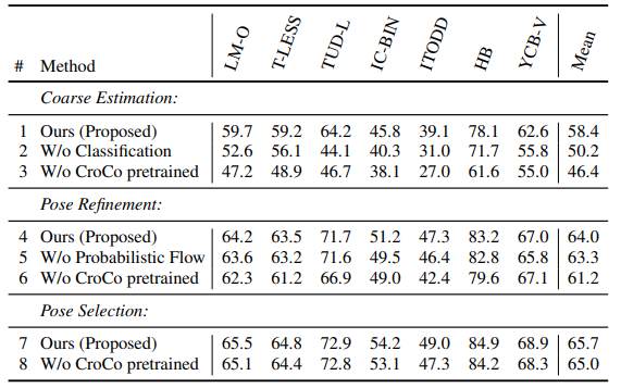 Pose Refinement 및 Selection 단계에서도 유사한 경향이 관찰됩니다. 리파인먼트 과정에서 Probabilistic Flow 모델링을 제외할 경우 정확도가 감소하게 되며. 모델의 모든 단계에서 제안된 구조와 사전 학습 모델의 결합이 가장 좋은 성능을 확보한것을 알수있습니다.