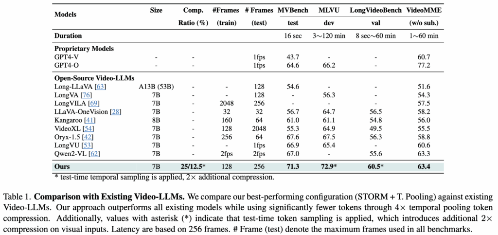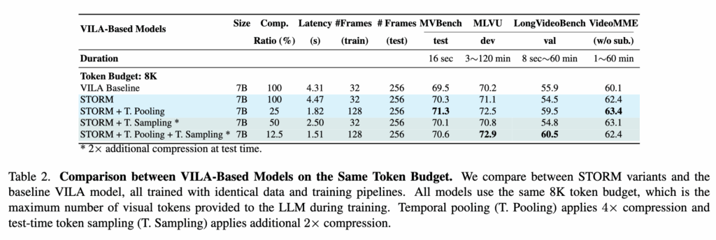 먼저, 저자들은 STORM + T. Pooling (+ T. Sampling) 설정을 기존 Video-LLM들과 비교합니다. Table 1에서 보이듯, STORM + T. Pooling은 모든 롱비디오 벤치마크에서 SOTA 성능을 달성했습니다. 여기서 STORM + T. Pooling이 LLM에 넣기 전에 시각 토큰을 원래의 25%로 압축하면서도 높은 성능을 유지했습니다. 또한 여기에 테스트 시점 시간 샘플링을 추가한 STORM + T. Pooling + T. Sampling은 효율을 더 높여 토큰 수를 12.5%까지 줄이면서도 높은 성능을 유지합니다.