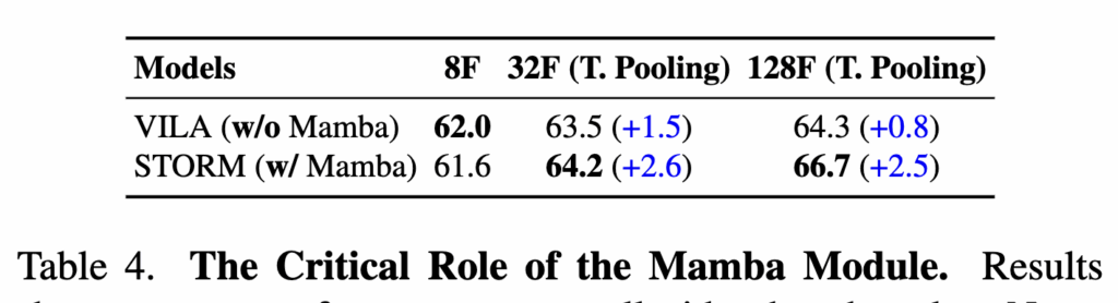 실험에서도 이 경향을 확인할 수 있는데 STORM은 입력 길이가 길어질수록 성능이 꾸준히 오르는 반면 baseline VILA는 개선 폭이 작습니다. 즉, 긴 입력에서 성능을 지키며 압축하기 위해 Mamba 모듈이 효과적이라는 것을 알 수 있습니다.