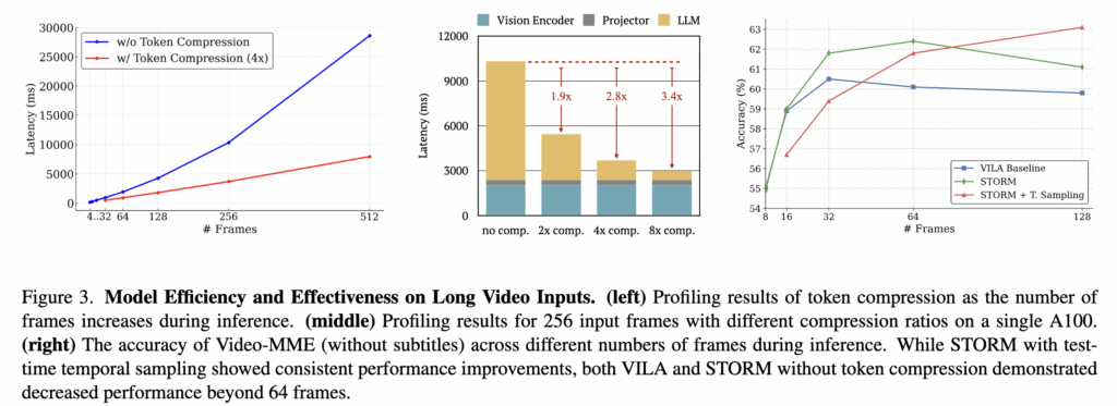 쉽게 말하면, “모든 프레임을 다 비슷하게 LLM에 던지는” 방식이 아니라, 시간축을 따라 누적된 핵심만 남긴 압축된 토큰 공간을 만들어 전달하는 구조입니다. 저자는 이를 위해 training-free 서브샘플링뿐 아니라 training 기반 압축(temporal/spatial token compression)까지 함께 고려합니다. 실험적으로 STORM은 롱비디오 입력에서 기존 베이스라인 대비 더 강한 성능을 보였고, 동시에 계산 효율 측면에서도 이점을 확인했습니다.