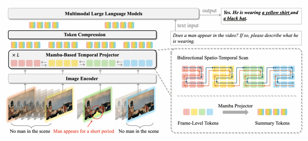 그럼 저자들이 제안한 Mamba 기반 temporal projector와, 긴 비디오 처리를 위해 도입한 토큰 압축 전략을 설명드리겠습니다.